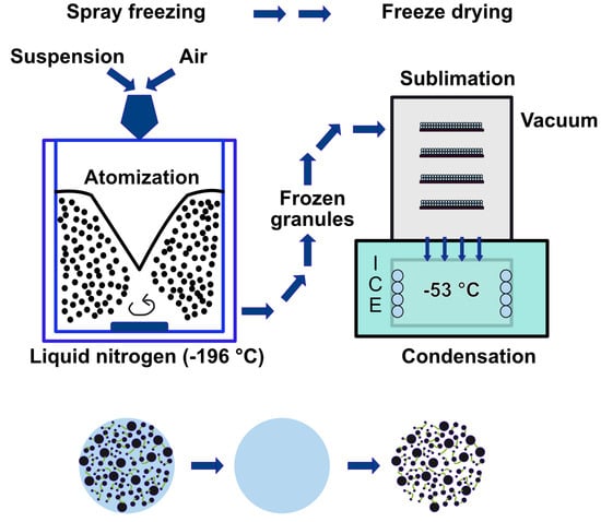 Granules were prepared using 25 vol.% of Halt B-26 binder through freeze granulation (FG), as shown in Figure 1. Granules were prepared by pouring the suspension containing powder into a chamber filled with liquid nitrogen under high-pressure air, resulting in the granules being coated with liquid nitrogen on their surfaces. Next, the frozen granules were collected and transferred for freeze drying, initiating the sublimation process, ultimately resulting in the production of freeze-dried granules with preserved homogeneity.