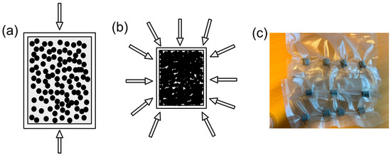 (a) Uniaxial pressing of granules, (b) isostatic pressing of the pre-pressed sample, and (c) samples in sealed vacuum bags after CIP.