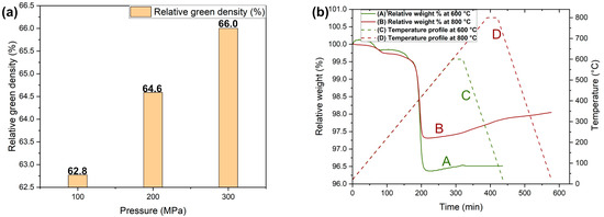 Relative green density of V4E after compaction at different CIP pressures of 100 MPa, 200 MPa, and 300 MPa (a). Debinding curves for V4E showing relative weight as a function of time for two different final debinding temperatures (b).