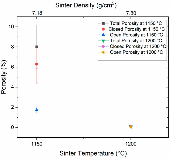 Open and closed porosity of V4E samples after sintering at 1150 °C and 1200 °C, measured using the Archimedes density method.