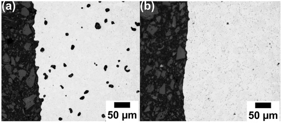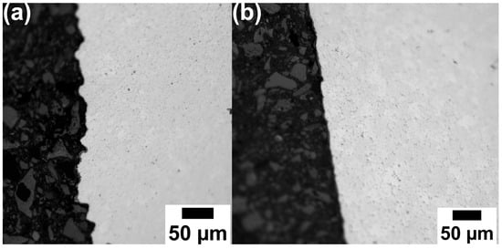 Figure 6 shows the unetched microstructural cross-sections of samples sintered at 1150 °C and 1200 °C, subjected to subsequent capsule-free HIP, hardening, and tempering. Characteristically, almost no pores were observed for both samples after the subsequent capsule-free HIP, hardening, and tempering (see Figure 6a,b). Compared to the appearance for the sample priorly sintered at 1150 °C (Figure 6a), Figure 6b demonstrates a smoother surface for the sample priorly sintered at 1200 °C, confirming an adequate sintering process as already seen from Figure 5b.