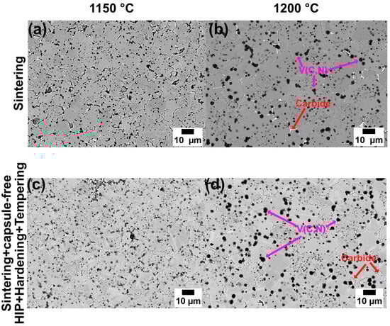 The SEM micrographs in Figure 7 reveal the microstructure of the V4E tool steel after sintering at 1150 °C and 1200 °C as well as after following capsule-free HIP, hardening, and tempering. The presence of vanadium-rich carbonitrides and molybdenum-rich carbides have been identified, consistent with observations from previous studies [21]. As the sintering temperature increases, there is a noticeable increase in grain size and the size of precipitates, particularly the dark-appearing ones, i.e., the vanadium carbonitrides (c.f. Figure 7a,b). During sintering in a nitrogen atmosphere, nitrogen dissolves into the material. The nitrogen absorption is preferentially accommodated by the transformation of VC to V(C,N) and the eventual progress to VN. Reaching VN requires, however, higher nitrogen activity than what is applied in this study. The V(C,N) is hereafter also referred to as MX as being vanadium-rich and nitrogen-rich carbonitride precipitates. As a consequence of the selective uptake of nitrogen into the MX, carbon is released into the austenite matrix and through liquid phase, the latter leading to emerge carbide in locations where liquid phase is formed. As will be discussed further later, it is supposed that the sintering in nitrogen could help reduce the solidus temperature, thereby resulting in better sintering control and enhanced densification. Figure 7d shows the distribution of the precipitates after thermal treatments of capsule-free HIP, hardening, and tempering. It can be seen that the presumed MX precipitates remain in the microstructure, and secondary carbides are also formed.