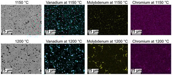 Precipitates containing vanadium and molybdenum are depicted in sintered samples using EDS mapping, as shown in Figure 8. From the figure, it can be seen that vanadium is present in the presumed MX precipitates while Mo and Cr are contained in the presumed carbide precipitates. It appears that MX precipitates shown by the vanadium mapping occur in two different sizes, with larger ones decorating the grain boundaries and smaller ones indicated inside the grains. For the carbide precipitates, they tend to occur predominantly at the grain boundaries.