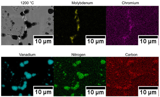 Figure 9 presents the EDS maps of V4E material after sintering at 1200 °C. The maps clearly revealed the presence of carbon and nitrogen within MX precipitates, indicating the formation of vanadium-rich carbonitrides.