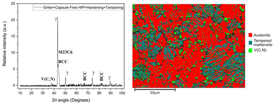 The X-ray diffraction analysis and EBSD mappings of V4E steel samples on all as-sintered conditions as well as on sintered samples, followed by capsule-free HIP, hardening, and tempering, were performed. Austenite is prevalent in all the samples; hence, for the representation of the phases in the final condition, the XRD pattern and EBSD mapping of the sample sintered at 1200 °C, followed by capsule-free HIP, hardening, and tempering, are depicted in Figure 10. The highest peak for the austenite existed at a 2θ position of 43.2°. The presence of phases such as austenite, tempered martensite, and V(C,N) is detected by both the XRD and EBSD characterisations. Here, tempered martensite is shown as BCC in the XRD plot as it is not possible to distinguish between BCC and highly tempered martensite in the diffractograms. It can be seen that a significant portion of austenite is present even after tempering, while regions of tempered martensite are occurring as expected. A previous study on cold work tool steel with high chromium content demonstrated that sintering in nitrogen atmosphere stabilized the austenite phase [35], and it also appears to be the case here. Furthermore, in accordance with Figure 7 and Figure 8, the presence of V(C,N) is confirmed.