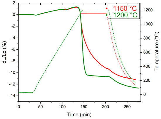 Dilatometry curves of V4E PM tool steel material at sintering temperatures of 1150 °C and 1200 °C.