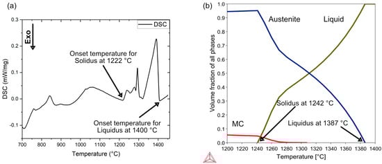 (a) DSC signal vs. temperature for V4E PM tool steel sample (b) Thermodynamic simulation of V4E using ThermoCalc software (2024a Version).