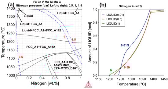 Thermodynamic calculations studies of V4E PM tool steel (a) at different pressures of nitrogen (b), with varying amounts of N in the sample.