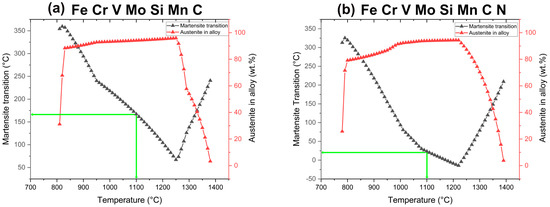 Martensite transition of V4E cold work tool steel with and without nitrogen predicted by JMatPro simulation (Version 12.4) for hardening temperature of 1100 °C (green line).