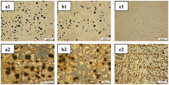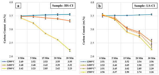 The results in Figure 1 also indicate that both studied samples manifested a reduction in carbon content from approximately 3.5% to as low as 2.2% at a temperature of 1500 °C within 30 min. A comparable decreasing tendency was also detected at 1400 °C, despite the LS-CI indicating a higher degree of carbon reduction than the HS-CI, measured at approximately 2.5% and 3.3%, respectively. An additional LS-CI sample melted in an alumina-based crucible at 1400 °C indicated a similar tendency of carbon reduction, as shown in Figure 1b. In contrast to those decreasing trends, a constant concentration of carbon was observed at 1300 °C for both samples during the 30-minute holding process.