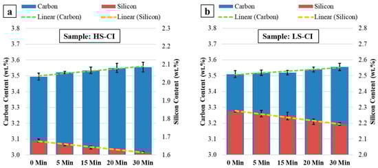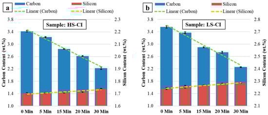 Nonetheless, although a constant carbon content was recorded during high-temperature holding at 1300 °C for both LS-CI and HS-CI, a disparity in silicon concentration was detected instead. The interplay is related to the temperature, yet in a counter way compared with the carbon content, as provided in Figure 2. These results indicate that the silicon content decreases with increasing holding time at 1300 °C. Comparatively, this decreasing tendency of silicon was not observed at 1500 °C, where the highest degree of carbon reduction was recorded instead, as provided in Figure 3.