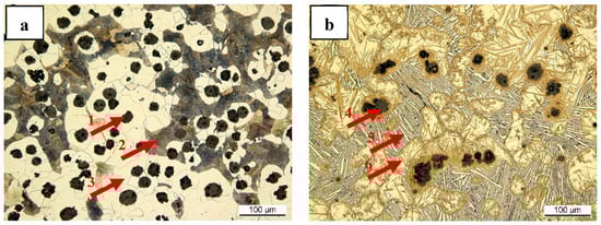 Microstructure of nital-etched LS-CI (a) before and (b) after ET-Exp (1200 °C for 10 min)—transforming (1) nodular graphite in (2) pearlite and (3) ferrite matrix system into (4) residual graphite in (5) ledeburite and (6) martensite matrix system.