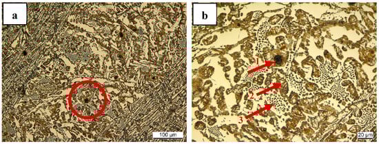 Microstructure of the nital-etched LS-CI after 15 minutes of holding at 1200 °C followed by water quenching indicating (a) residual graphite in red circle detailed in (b): (1) graphite, (2) martensite, and (3) ledeburite.
