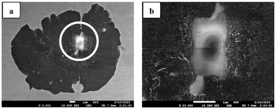 (a) Rest nodular graphite and (b) detail of its nonmetallic nucleus in the LS-CI sample.