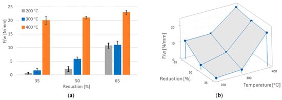 - At 300 °C and 65% reduction, good bonding quality was observed, with no significant decrease in force after crack initiation during the peel tests. At 35% reduction, bonding was weak, while an intermediate condition was found at 50% reduction.
