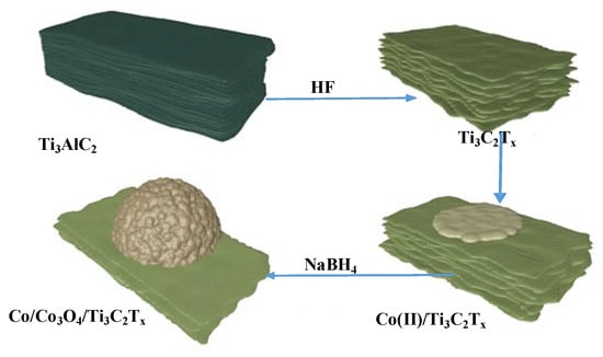 The reagents used are as follows: Co(NO3)2·6H2O (analytical grade, Sinopharm Chemical Reagent Co., Ltd., Shanghai, China), NaBH4 (analytical grade, Sinopharm Chemical Reagent Co., Ltd., Shanghai, China), Ti3AlC2 (analytical grade, Zhejiang Yamei Nano Technology Co., Ltd., Jiaxing, China) and HF (analytical grade, Shanghai Aladdin Technology Co., Ltd., Shanghai, China).