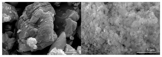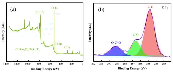 The surface morphologies of Ti3C2Tx and Co/Co3O4/Ti3C2Tx were characterized using an SEM, and the results are shown in Figure 3. It can be observed from Figure 3a that the Ti3C2Tx obtained via HF etching Ti3AlC2 has an obvious “organ-like” morphology, which is conducive to the active substance to penetrate the internal structure of Ti3AlC2. The morphology is formed due to the destruction of Ti-Al bonds between the etched layers, which is consistent with other researchers’ reports []. It can be clearly observed from Figure 3b that the surface of the obtained Co/Co3O4/Ti3C2Tx has particle clusters with different sizes and shapes. The formation of these particles can be attributed as follows: during the reduction reaction, a large amount of Co2+ is reduced by NaBH4 to zero-valent Co, which accumulates and deposits on the surface of Ti3C2Tx [].