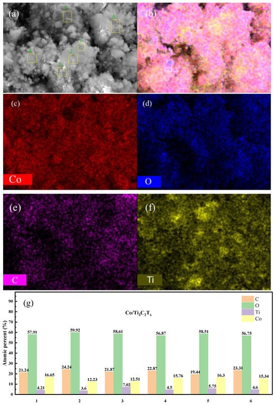 Elemental analysis diagram of Co/Co3O4/Ti3C2Tx. (a) SEM diagram of Co/Co3O4/Ti3C2Tx; (b) EDS mapping of Co/Co3O4/Ti3C2Tx and (c) Co element, (d) O element, (e) C element and (f) Ti element; (g) atomic ratios of Co, O, C and Ti elements.