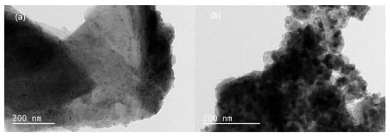 In order to further explore the structural information of catalysts, the morphologies of Ti3C2Tx and Co/Co3O4/Ti3C2Tx were observed using a TEM, and the results are shown in Figure 5. It can be seen from Figure 5a that Ti3C2Tx presents a unique two-dimensional sheet structure with many active edge sites, which can provide a large number of attachment sites for the loaded active substances. As shown in Figure 5b, a large number of clusters are attached to the surface of the layered Co/Co3O4/Ti3C2Tx. This may be because NaBH4 reduced a large amount of Co2+ to Co, and then, Co particles gathered and deposited on the surface of Ti3C2Tx [], which was consistent with the results of the SEM analysis.