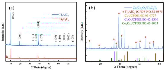 XRD patterns of Ti3AlC2, Ti3C2Tx and Co/Co3O4/Ti3C2Tx. (a) Ti3AlC2 and Ti3C2Tx; (b) Co/Co3O4/Ti3C2Tx.