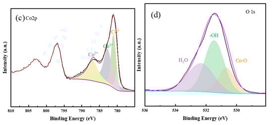 The elemental composition of the Co/Co3O4/Ti3C2Tx catalyst was analyzed using XPS. Figure 7a shows the full XPS spectrum of Co/Co3O4/Ti3C2Tx, and binding energy peaks corresponding to Co, O, Ti, C and other elements can be clearly seen in the full spectrum. Furthermore, the fine spectrum of C1s was obtained via narrow-area scanning (Figure 7b), which can be divided into three peaks with binding energies of 284.8 eV, 286.4 eV and 289.0 eV, corresponding to C-C, O-C and O-C=O, respectively [,]. Figure 7c shows the fine spectrum of Co2p, which can be divided into three peaks with binding energies of 780.1 eV, 781.1 eV and 782.7 eV, respectively, attributed to Co0, Co3+ and Co2+ [], indicating that Co exists in the form of metallic Co and in the oxidation state as Co3O4, which is consistent with the XRD analysis results. It is worth noting that most of the Co2p peaks are Co2+. Figure 7d shows the fine spectrum of O1s, which can be divided into three characteristic peaks with binding energies of 530.7 eV, 531.2 eV and 532.2 eV, respectively, attributed to Co-O, −OH and O in the adsorbed H2O [], which means that O in the catalyst exists in two forms: lattice oxygen and surface hydroxyl oxygen. The surface of the catalyst contains both cobalt oxide (Co-O) and cobalt hydroxide (Co-OH), which can effectively accelerate the dissociation of water [,]. In addition, the appearance of the binding energy peak corresponding to oxygen in the adsorbed H2O also indicates that the catalyst has a certain hydrophilicity.