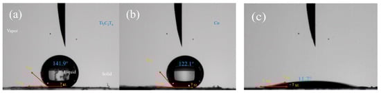 Contact angles of Ti3C2Tx, Co and Co/Co3O4/Ti3C2Tx. (a) Ti3C2Tx, (b) Co and (c) Co/Co3O4/Ti3C2Tx.