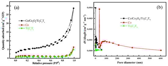 N2 adsorption–desorption curves and pore size distributions of Ti3C2Tx, Co and Co/Co3O4/Ti3C2Tx. (a) N2 adsorption–desorption curve; (b) pore size distribution (0–600 nm).
