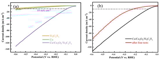 The HER electrocatalytic activities of Ti3C2Tx, Co and Co/Co3O4/Ti3C2Tx were tested in a 0.5 mol L−1 H2SO4 solution, and the LSV results are shown in Figure 10a. It can be seen from Figure 9a that the electrocatalytic activities of Ti3C2Tx and Co are very low. However, when Ti3C2Tx and Co formed Co/Co3O4/Ti3C2Tx, the electrocatalytic performance was significantly improved. Furthermore, the η values corresponding to Ti3C2Tx, Co and Co/Co3O4/Ti3C2Tx at a current density of 10 mA cm−2 were obtained, and they were 599 mV, 517 mV and 86 mV. However, after only four LSV tests, the η value of Co/Co3O4/Ti3C2Tx was changed from an initial 86 mV to 225 mV (see Figure 10b). The results show that Co/Co3O4/Ti3C2Tx has poor durability in a 0.5 mol L−1 H2SO4 solution and is not suitable for long-term use in an acidic medium. The reasons for the sharp decline in the catalytic activity of Co/Co3O4/Ti3C2Tx in an acidic electrolyte may be as follows: Co and Co3O4 were easily dissolved in strong acids. The stability test shows that the Co/Co3O4/Ti3C2Tx catalyst is not suitable for long-term use in an acidic medium.