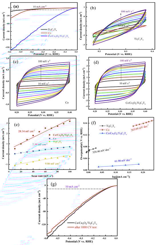 (a): LSV diagram of Ti3C2Tx, Co and Co/Co3O4/Ti3C2Tx in 1 mol L−1 KOH electrolyte; CV results of (b) Ti3C2Tx, (c) Co and (d) Co/Co3O4/Ti3C2Tx under different scanning rates (10, 20, 30, 40, 50, 60, 70, 80, 90 and 100 mV s−1); (e) Cdl value and (f) Tafel diagram of Ti3C2Tx, Co and Co/Co3O4/Ti3C2Tx; (g) LSV diagram of Co/Co3O4/Ti3C2Tx (stability test) in 1 mol L−1 KOH electrolyte.