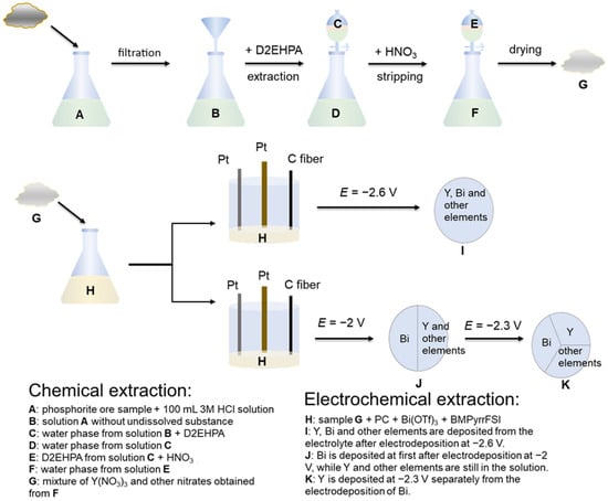 The separation of Y and REEs from natural phosphorite ore samples, followed by Y separation from other REEs, has been the focus of this study. The sample of Estonian phosphorite ore [,,] was dissolved in 3 M hydrochloric acid aqueous solution, followed by liquid extraction with bis(2-ethylhexyl) phosphate [,]. After stripping the sample with concentrated nitric acid, a mixture of calcium, Y, heavy REEs, and some other trace element nitrates was formed [,,,]. The material received was dissolved in propylene carbonate in an argon atmosphere inside a glovebox; bismuth (III) trifluoromethanesulfonate (Bi(OTf)3) was added for Bi(3+) cations introduction, and 1-Butyl-1-methylpyrrolidinium bis(fluorosulfonyl)imide (BMPyrFSI) ionic liquid was added to enhance the electric conductivity of the working solution. An electrochemical study was performed, followed by an electrochemical reduction experiment when the reduction potential of Y was reached.
