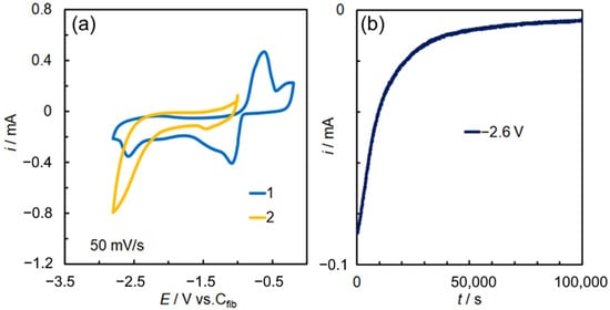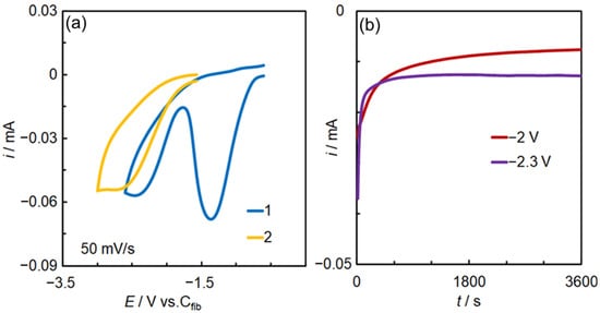 (a) Cyclic voltammograms for 0.2 M BMPyrFSI and 50 mM Bi(OTF)3 in PC with addition of REEs extraction product G electrolyte system at potential scanning rate 50 mVs−1. Curve 1 shows Bi redox processes, and 2 is measured below the Bi redox process range. (b) Chronoamperometry data at E = −2.6 V for 0.2 M BMPyrFSI + 50 mM Bi(OTF)3 +REE extraction solution H during 27 h electrodeposition.