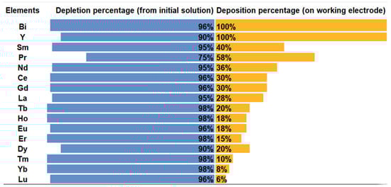 A black-coated layer was formed on the Pt working electrode’s surface during the electrodeposition processes of Bi, Y, and REEs. Therefore, the working electrode surface was rinsed with propylene carbonate and introduced into a concentrated nitric acid. At the same time, black precipitated material was observed at the bottom of the electrochemical cell (less than 20% of total mass). As seen in Figure 4, the concentration of most elements in the initial solutions has decreased significantly. At the same time, not all materials have been obtained from the working electrode. It has been previously suggested by Jürjo et al. [] that some elements electrochemically reduced at the working electrode surface (from metallic cations to 0-valence state metals) are delaminated from the working electrode’s surface and incorporated into the black precipitate found on the bottom of the electrochemical cell.