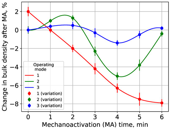 The studies conducted in the first stage allowed us to establish that during the processing of nickel powder with balls for 4 min, the change in bulk density is within the measurement error (Figure 2). Both Mode 1 and its variation exhibit a minimal change in bulk density, indicating that the processing conditions for Mode 1 are stable and produce consistent results. Mode 2 and its variation might show a slightly higher or lower change in bulk density, pointing to some sensitivity to parameter variations. However, the changes still fall within the measurement error. Like Modes 1 and 2, Mode 3 and its variation maintain bulk density changes within the measurement error, implying that even with variations, the process does not significantly alter the bulk density.