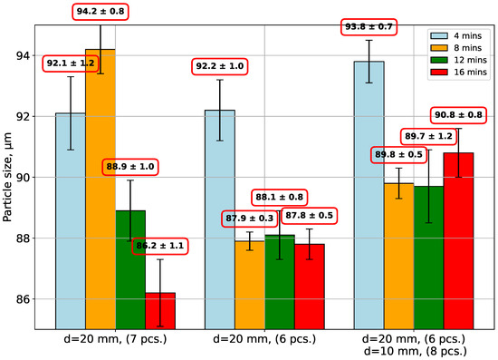 It is worth noting that for the container loaded with 7 balls with a diameter of 20 mm, this trend is observed up to 16 min of processing. However, when analyzing the apparent particle size (Figure 3), a dependency indicating a decrease in the apparent particle size with increasing processing time for loading with seven 20 mm diameter balls is traced. For processing with 7 balls of 20 mm diameter, at 4 min, the particle size is larger compared to the subsequent stages. By 8 min, the particle size shows a noticeable decrease. At 12 min, the reduction in particle size continues, indicating that the longer processing time facilitates breaking down the particles further. By 16 min, the particle size reaches a lower value, suggesting that the extended processing time consistently reduces the particle size. For 6 balls of 20 mm diameter, the particle size also decreases with increased processing time but may not reduce as significantly as with 7 balls. For 6 balls of 10 mm diameter, similar trends of particle size reduction are observed, though the final sizes differ slightly. For 8 balls of 10 mm diameter, there is a consistent decrease in particle size, comparable to the 7 balls of 20 mm diameter configuration.