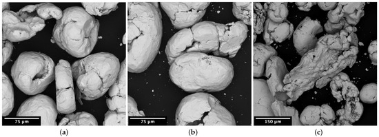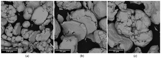 Images of nickel powder during its processing using 6 balls of 20 mm diameter combined with 8 balls of 10 mm diameter for 16 min. (a) magnification ×500; (b,c) magnification ×1000.