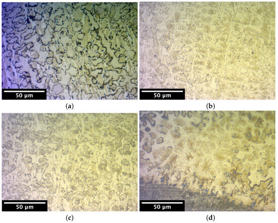 At the second stage, deposition with nickel powder introduction into the weld pool, with and without MA, was conducted. The microstructure of the deposited metal with the introduction of nickel powder not subjected to MA consists of a solid solution alloyed with chromium, silicon, and carbon (Figure 7a). Primary needle-like chromium carbides are also present in the structure, located in the eutectic, along with niobium carbides formed due to the alloying of the deposited metal with components of the powder wire blend. When introducing nickel powder after MA into the deposited metal, the formation of martensite grains in the solid solution was detected, as well as changes in the amount of eutectic (Figure 7b–d).