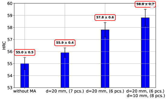 Additionally, an increase in the hardness of the deposited metal was observed when introducing nickel powder after MA (Figure 8). Moreover, the higher the deformation of nickel powder after MA, the higher the hardness of the deposited metal. The variations in hardness of the deposited metal are directly linked to the MA process and the resulting deformation of nickel powder. The introduction of MA leads to a marked increase in hardness, with higher deformation corresponding to greater hardness. The configuration using 7 balls of 20 mm diameter produces the highest hardness, followed by 6 balls of 20 mm diameter and 8 balls of 10 mm diameter. This indicates that both the number and size of the balls used in the MA process significantly affect the degree of deformation and the resulting hardness of the deposited metal. Further studies could investigate optimizing the combination of ball size and quantity to achieve the desired hardness level.