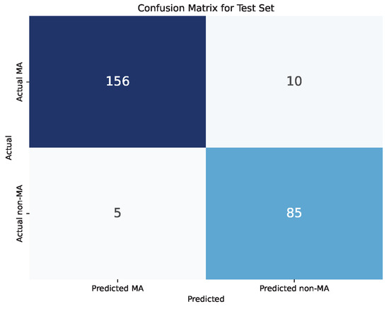 Figure 10 illustrates confusion matrix for the test set and shows the distribution of true positives, true negatives, false positives, and false negatives for the predicted classifications of microstructure images with and without MA treatment. The high values along the diagonal (156 and 85) indicate the model’s strong performance in correctly identifying the images, while the low values off the diagonal (10 and 5) reflect the relatively few misclassifications.