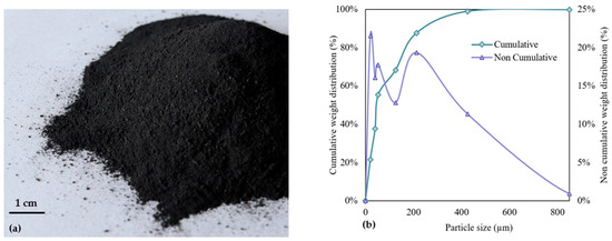 The analyzed sample was obtained by demagnetizing and grounding waste material from the hydrogen decrepitation of permanent magnets. The photographic image is shown in Figure 1a. The sample appears as a black powder. The granulometric analysis of the samples is shown in Figure 1b. Based on the plot, the d80 of the sample was about 180 μm.