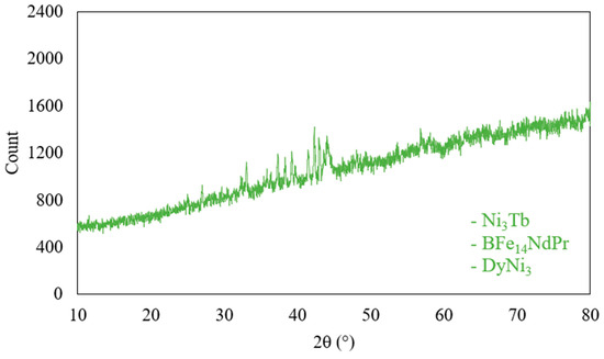 The sample was also analyzed by energy-dispersive X-ray spectroscopy. Figure 2 shows the results of the XRD analysis of the used NdFeB magnet sample. Plastic and ceramic fractions in the material resulted in an XRD spectrum with significant background noise. Before the leaching process, the material contains mainly Ni3TB, BFe14NdPr, and DyNi3.