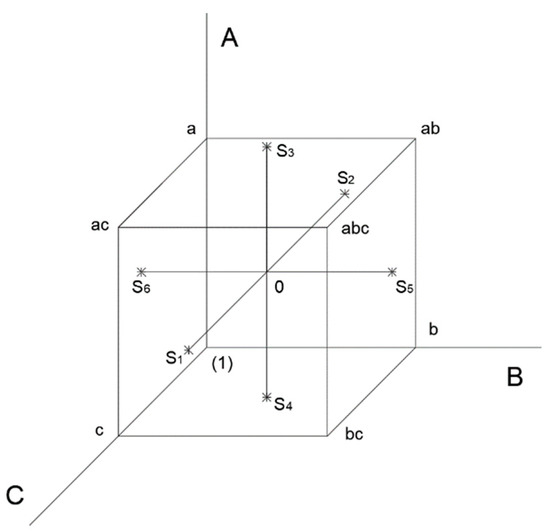 Design of experiments using 23, with CCD factorial plan and six-star points (S1, S2, S3, S4, S5, and S6). A is citric acid concentration, B is the reaction time, and C is the S/L ratio.