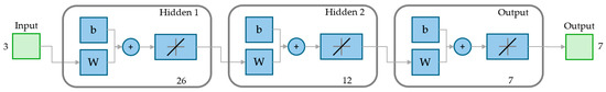 This work used the feed-forward ANN, employing a back-propagation algorithm to model the relationship between the explanatory variables and the total REEs (TREE) leaching efficiency using MATLAB R2023b. The back-propagation algorithm reduces the error between output and input data by altering the weighted connections between neurons [28,31]. The architecture of the 3-26-12-7 neural network used in this work, which was chosen for its ability to handle the complexity of the data and the relationships between the variables, is shown in Figure 4.