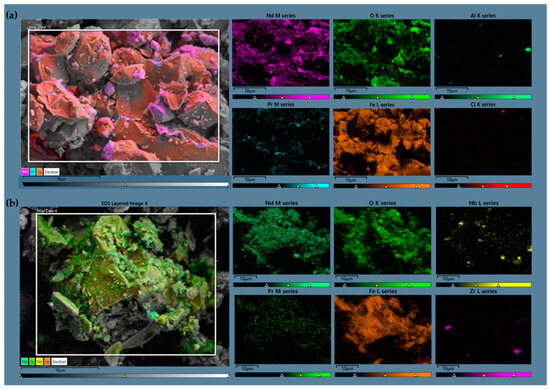 Figure 6a,b shows the results of elemental mapping conducted on both the material before leaching and on the residual solid. There are no significant differences between the two samples; however, it was possible to identify some contaminants. Traces of Al and Cl were found in the feed, and traces of Zr and Nb were observed in the leaching residue solids. The latter could be present due to the fact that some production processes for NdFeB magnets use Nb to improve the properties of the future alloy [34]. The differences between the elements found in the residual solid and not in the feed are mainly due to their low concentration in the initial sample, as well as a very slow dissolution kinetics or a completely inert behavior. The reduction of the average particle diameter allowed for better identification after leaching.