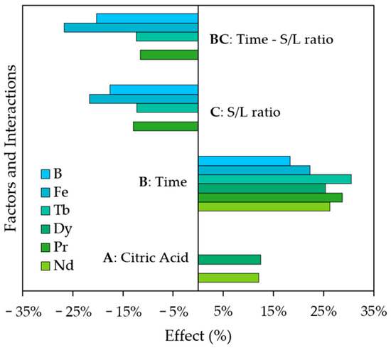 The element most influenced by the increase in reaction time is Tb, with an increase in the recovery yield of about +30% when increasing the reaction time from 1 h to 3 h. On the contrary, the element least influenced by time was B, with an increase in yield of about 20% in the time interval considered. From a physical point of view, the high significance of time for all elements and the very similar effects between them suggests that the dissolution kinetics are very similar, with significant effects in the first three hours of reaction. This result is also confirmed by the results of a previous study on the influence of citric acid on the extraction kinetics of REEs, Fe, and B [26].