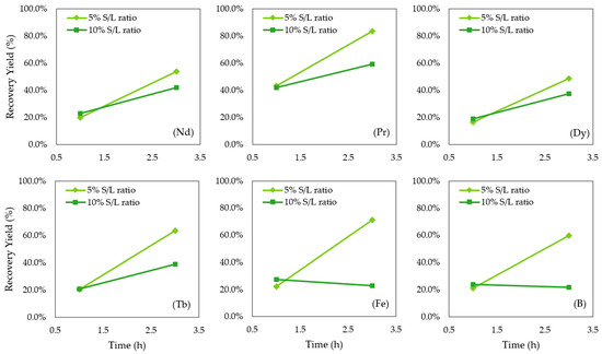The only significant interaction is that between time and solid–liquid ratio. This interaction affects the yields, with a 10–30% decrease for all elements except Nd and Dy. This result suggests that the solid–liquid ratio significantly affects the kinetics of the recovery yield. At a lower solid–liquid ratio (5%), the dissolution kinetics are faster, leading to a faster increase in recovery yield compared to that from a higher S/L ratio (10%). This phenomenon is due to better diffusion, less interference from reaction products, and gradual solvent saturation. For Nd and Dy, the kinetics are not significantly affected by this interaction. The effects of the second-order interactions on the recovery yields are shown in the two-way diagrams reported in Figure 8.