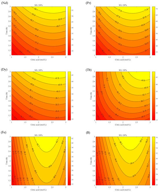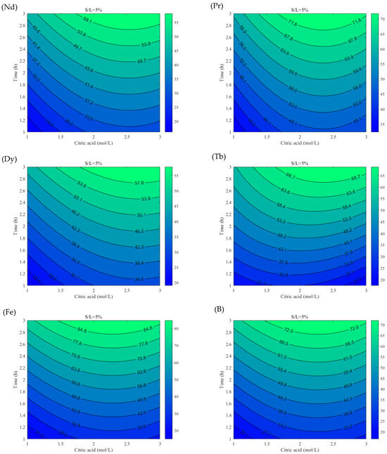 As can be seen from the figures, the shapes of the surfaces are very similar if we consider a solid–liquid ratio of 5%wt./vol. This result is not obtained with a solid–liquid ratio of 10%wt./vol. In this case, we can see how the REEs behave similarly to each other (a slight difference can be observed for Tb) but very differently compared to Fe and B. The latter have surfaces of the same shape. The slight difference for Tb is due to the presence of significative additional terms in the surface equation compared to the composition of the other REEs (these terms describe a higher curvature of the contour lines than those of other REEs.).
