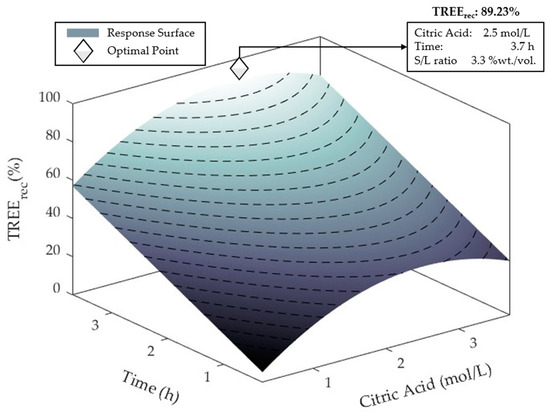 The point that maximizes the recovery yield of TREE in the experimental space investigated is characterized by a citric acid concentration of 2.5 mol/L, a time of 3.7 h, and a solid–liquid ratio of 3.3%wt./vol. These operating conditions allow for a good recovery yield of about 89.23%.