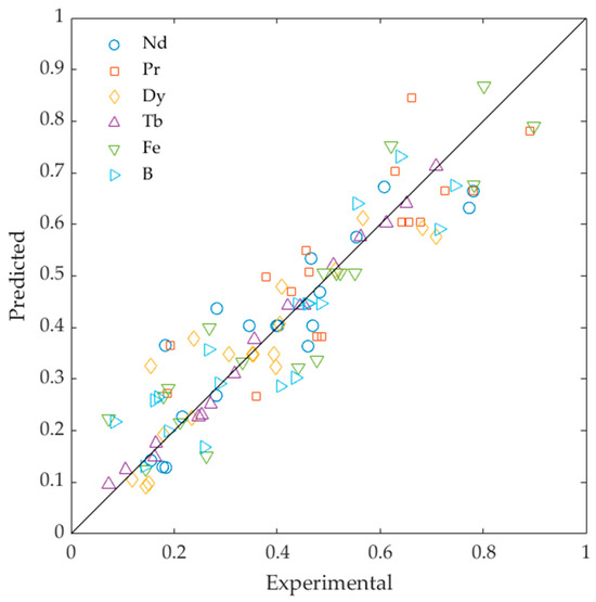 Figure 12 shows the scatter plot for all analyzed response surfaces. This plot allows for the comparison of the experimental and predicted values for all analyzed elements. The results show that the identified surfaces can successfully predict the experimental values. However, the data show a slight dispersion around the ideal line (diagonal), indicating that the predicted values do not always perfectly match the experimental values. This dispersion seems more pronounced for values lower than 0.4, with a more significant variability in the expected values. For higher values of 0.4, there is a greater tendency for the points to concentrate near the ideal line.