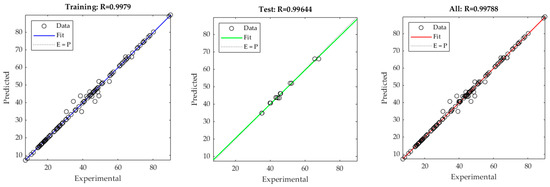 The results are reported in Figure 13. With this new configuration, the correlation coefficient R for the training was 0.998. The R values for the testing and the overall model were 0.996 and 0.998, respectively. The training process was ended for this ANN after 11 iterations of the 300-target value.