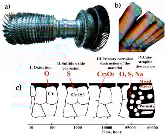 The reliability of industrial gas turbine units (Figure 1a) largely depends on the resistance of the metal nozzle blades to sulfide–oxide corrosion (Figure 1b), caused by sodium sulfate (Na2SO4), sodium chloride (NaCl), etc.